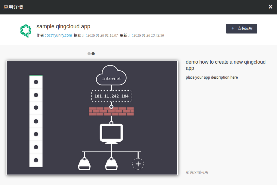 在预览试图里面测试通过以后,就可以提交应用。青云的管理员会审核您提交的应用,通过以后能显示到应用中心里面。