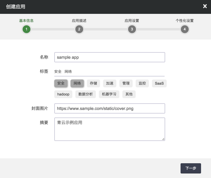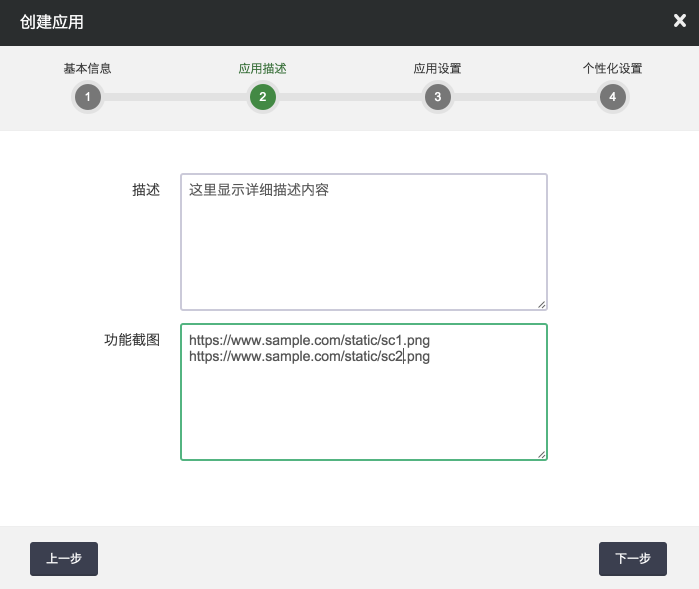 其中标签代表应用的提供的功能,会影响到应用中心的分类。接下来需要输入应用的文字和图片描述。图片URL至少需要一个,以换行分隔。