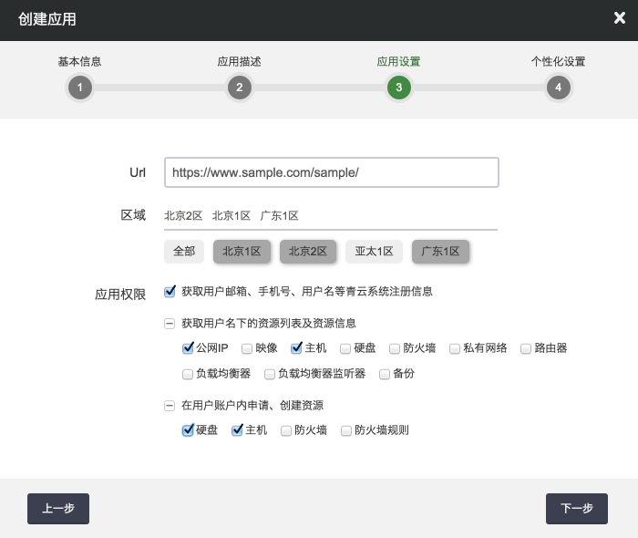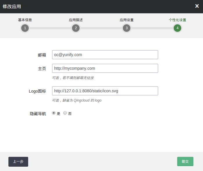 下一步个性化设置需要您输入一些信息,包括联系方式,公司网址,应用图标等。点击提交完成创建应用。