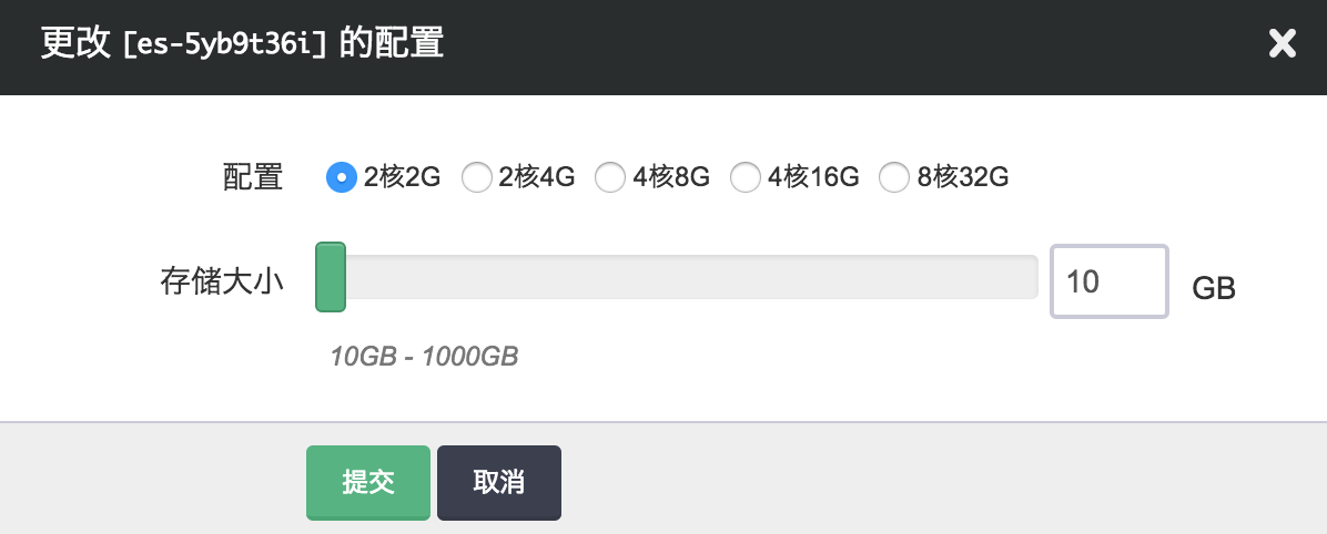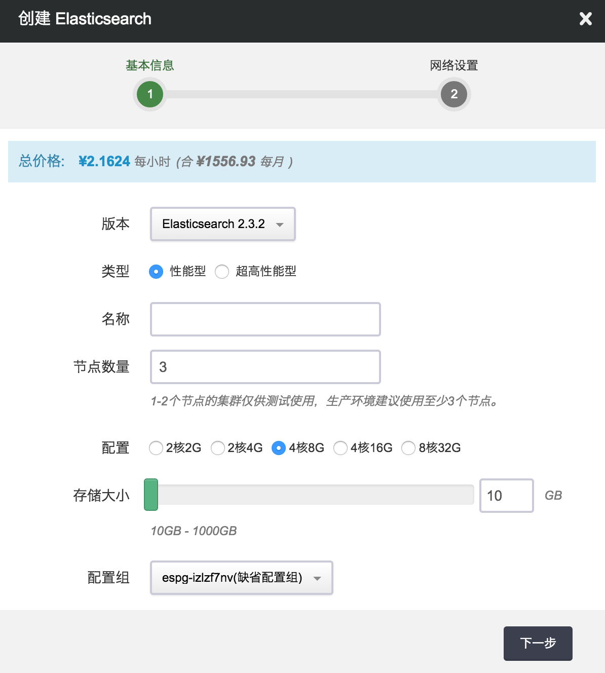 在创建的对话框中,您需要选择 Elasticsearch 版本号、CPU、内存配置,填写名称(可选)和节点数量以及选择磁盘大小。