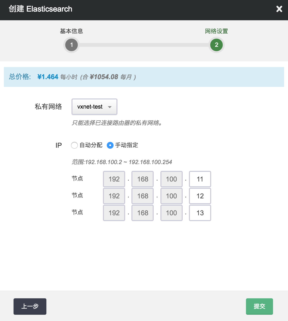 在配置网络的过程中,首先需要选择 Elasticsearch 要加入的私有网络。然后可以为 Elasticsearch 中的每个节点指定 IP, 也可以选择“自动分配”,让系统自动指定 IP。