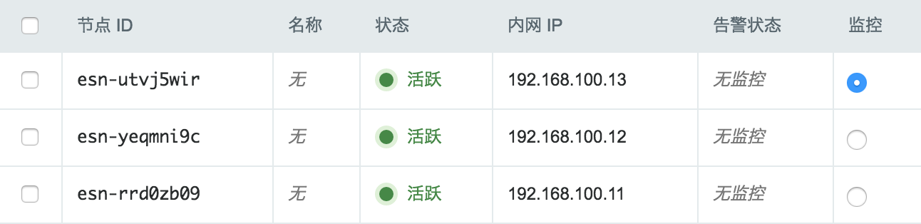 当 Elasticsearch 创建完成之后,您可以查看每个节点的运行状态。 如图所示,当节点显示为“活跃”状态,表示该节点启动正常。 当每个节点都启动正常后 Elasticsearch 集群显示为“活跃”状态,表示您已经可以正常使用 Elasticsearch 服务了。