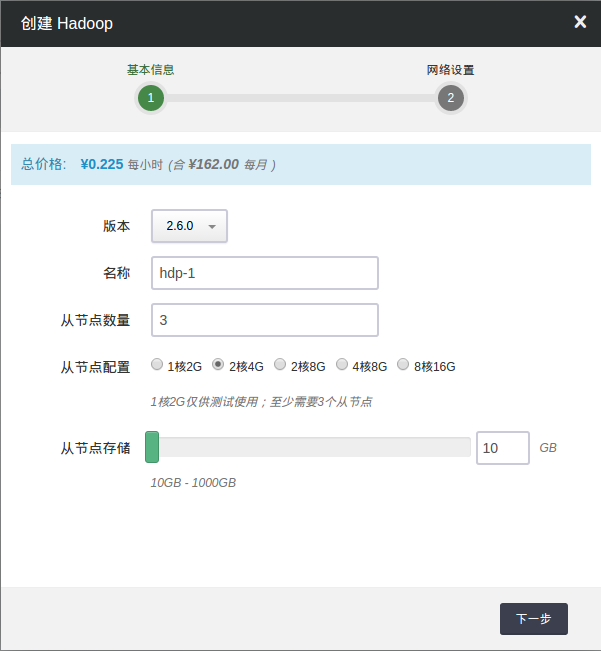 在创建的对话框中,您需要选择 Hadoop 版本号、CPU及内存配置,从节点存储大小,填写名称(可选)和从节点数量等。
