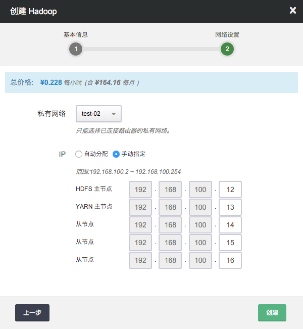 在配置网络的过程中,首先需要选择 Hadoop 要加入的私有网络,然后可以为 Hadoop 中的每个节点指定 IP, 也可以选择“自动分配”,让系统自动指定 IP。