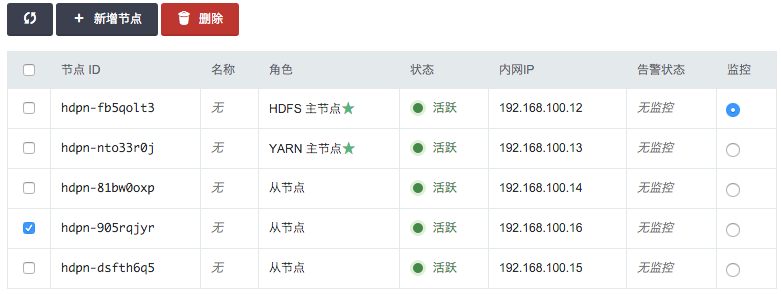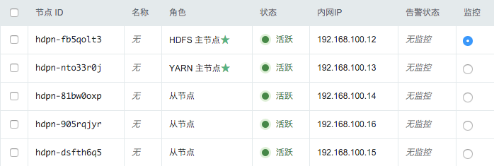 当 Hadoop 创建完成之后,您可以查看每个节点的运行状态。 如图所示,当节点显示为“活跃”状态,表示该节点启动正常。 当每个节点都启动正常后 Hadoop 集群显示为“活跃”状态,表示您已经可以正常使用 Hadoop 服务了。