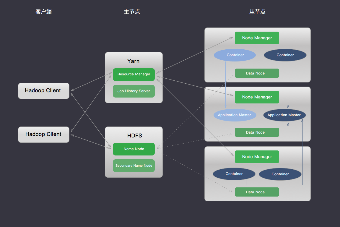 Hadoop 集群采用的是 master/slave 架构,青云提供的 Hadoop 集群服务还包括在线伸缩、监控和告警等功能,帮助您更好地管理集群。 如下图所示,青云的 Hadoop 集群分三种节点类型:主节点 (Yarn Resource Manager 和 HDFS Name Node),从节点 (Yarn Node Manager 和 HDFS Data Node) 和客户端节点 (Hadoop Client Node)。 用户在客户端节点发起Map Reduce 任务,通过与 HDFS 和 Yarn 集群中各节点的交互存取文件和执行 MapReduce 任务,获取结果。详情见下面测试 Hadoop 集群章节。