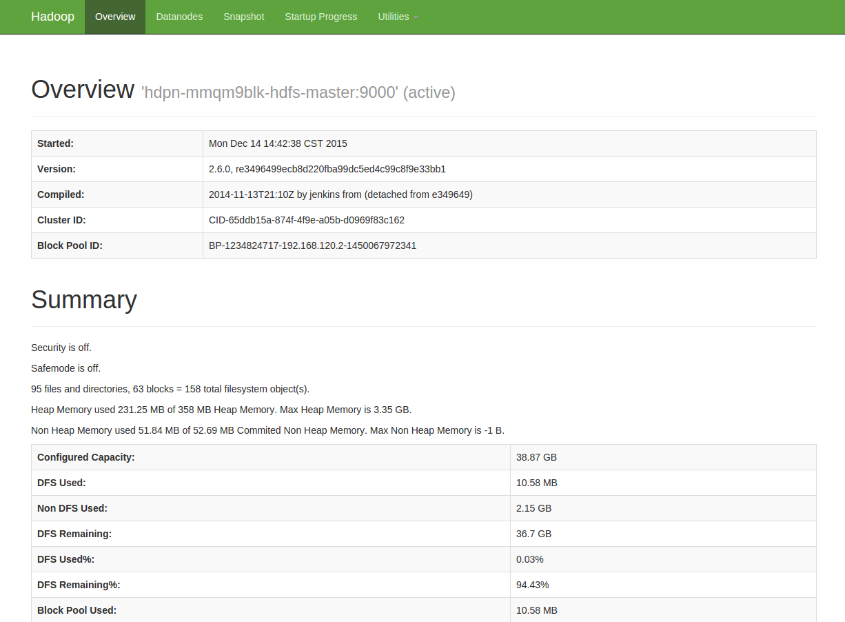 假设 HDFS master node的 URL 为 hdfs://hdpn-8ct52oqk-hdfs-master:50070。这个 URL 可以在您控制台 Hadoop 详情页查到,也可以在 Hadoop 提供的监控页查到(请参考下面的监控告警章节)