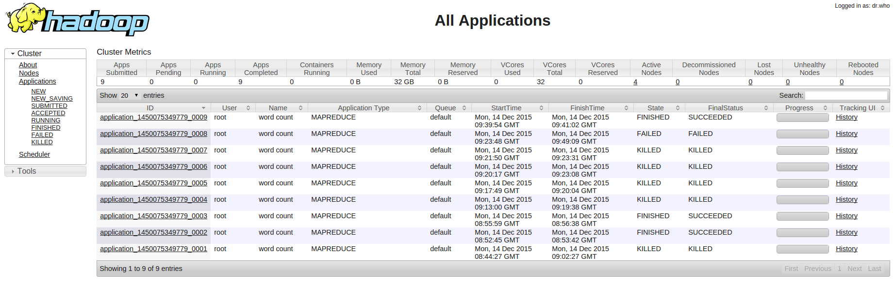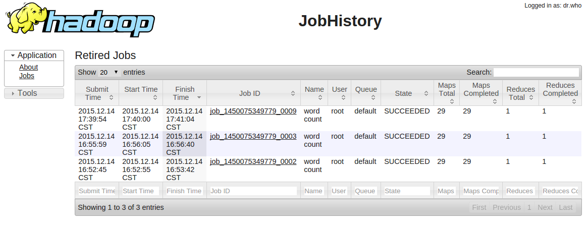 Hadoop HDFS, Yarn 和 MapReduce 提供了丰富的监控信息。如果需要通过公网访问这些信息您需要先在路由器上设置端口转发,同时打开防火墙相应的下行端口。HDFS Name Node 默认端口是50070, Yarn Resource Manager 默认端口8088, MapReduce Job History Server 默认端口19888 提供了集群的信息。因此私网可以访问以下 URL: