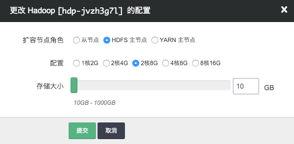 由于不同类节点压力并不同,所以青云 Hadoop 支持对 Yarn Resource Manager 主节点、HDFS Name Node 主节点 和 Hadoop 从节点分别进行纵向伸缩。通常情况下两个主节点的压力不会太大, 在创建 Hadoop 的时候我们自动给两个主节点分配较低配置,但随着压力增大您可能需要对这些节点扩容。