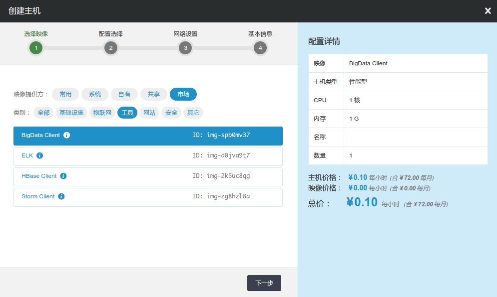 首先,您需要使用映像市场的 BigData Client 创建一个主机,如下图所示。该主机已经安装了Hue, MySQL, JRE等软件。