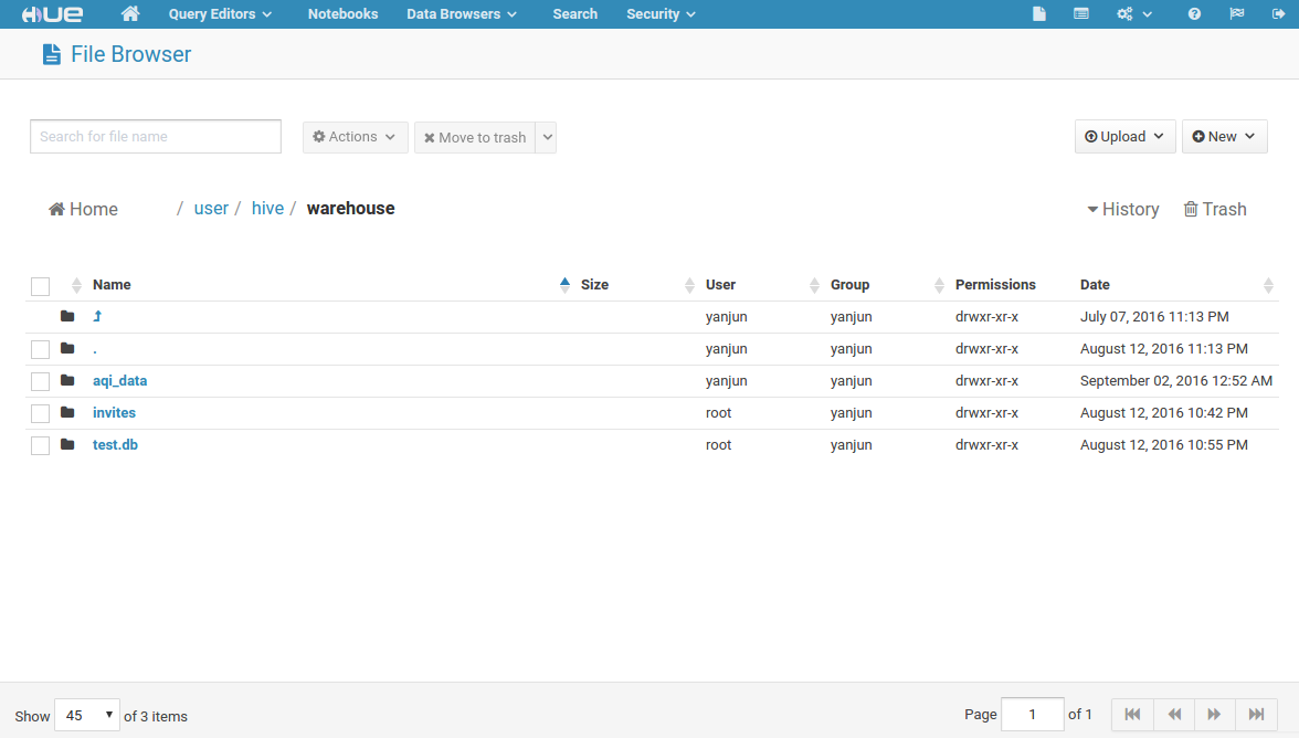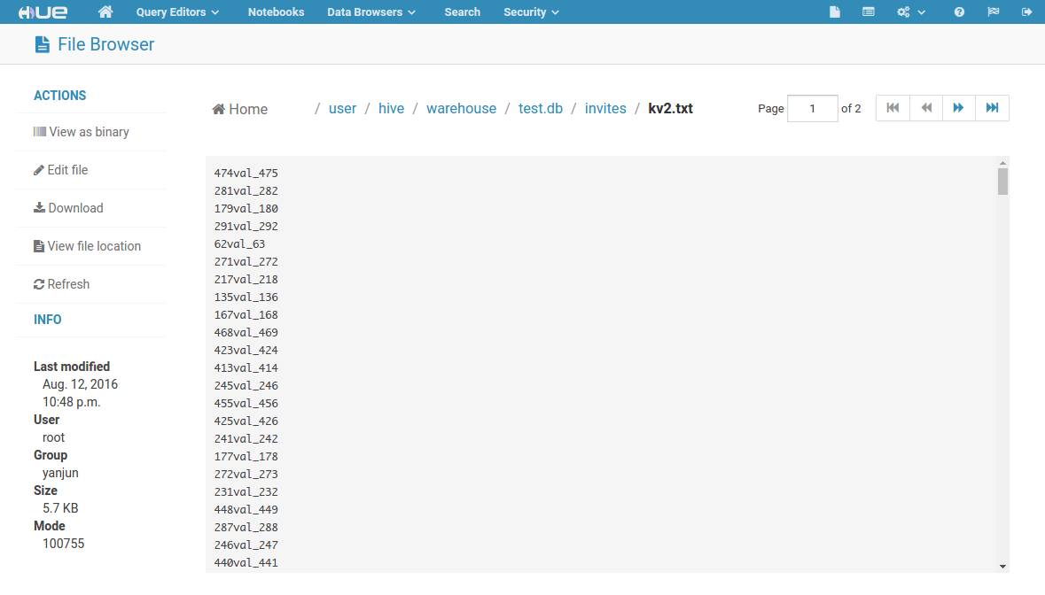 Hue为HDFS提供了非常方便的UI界面,可以通过点选来进行分布式文件系统的各项操作,包括查看文件/目录、上传文件/目录、创建文件/目录、在线修改文本文件等,如下图所示: