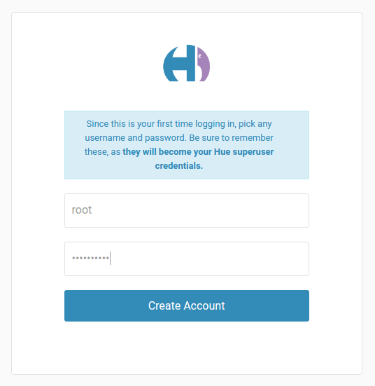 由于hue对Hadoop集群操作是以hue账户名义进行的,因此建议您使用root作为第一次创建的用户。