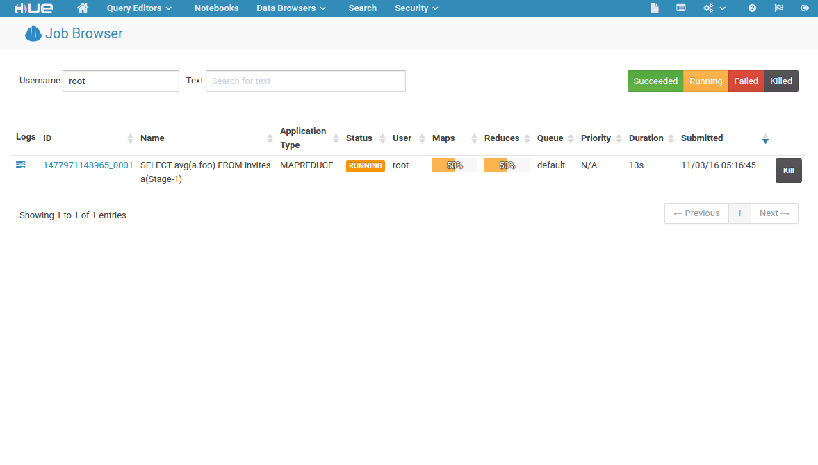 脚本提交后,一个Hive Job开始工作,可以通过Hue提供的Yarn工具,查看Job状态,如图所示:
