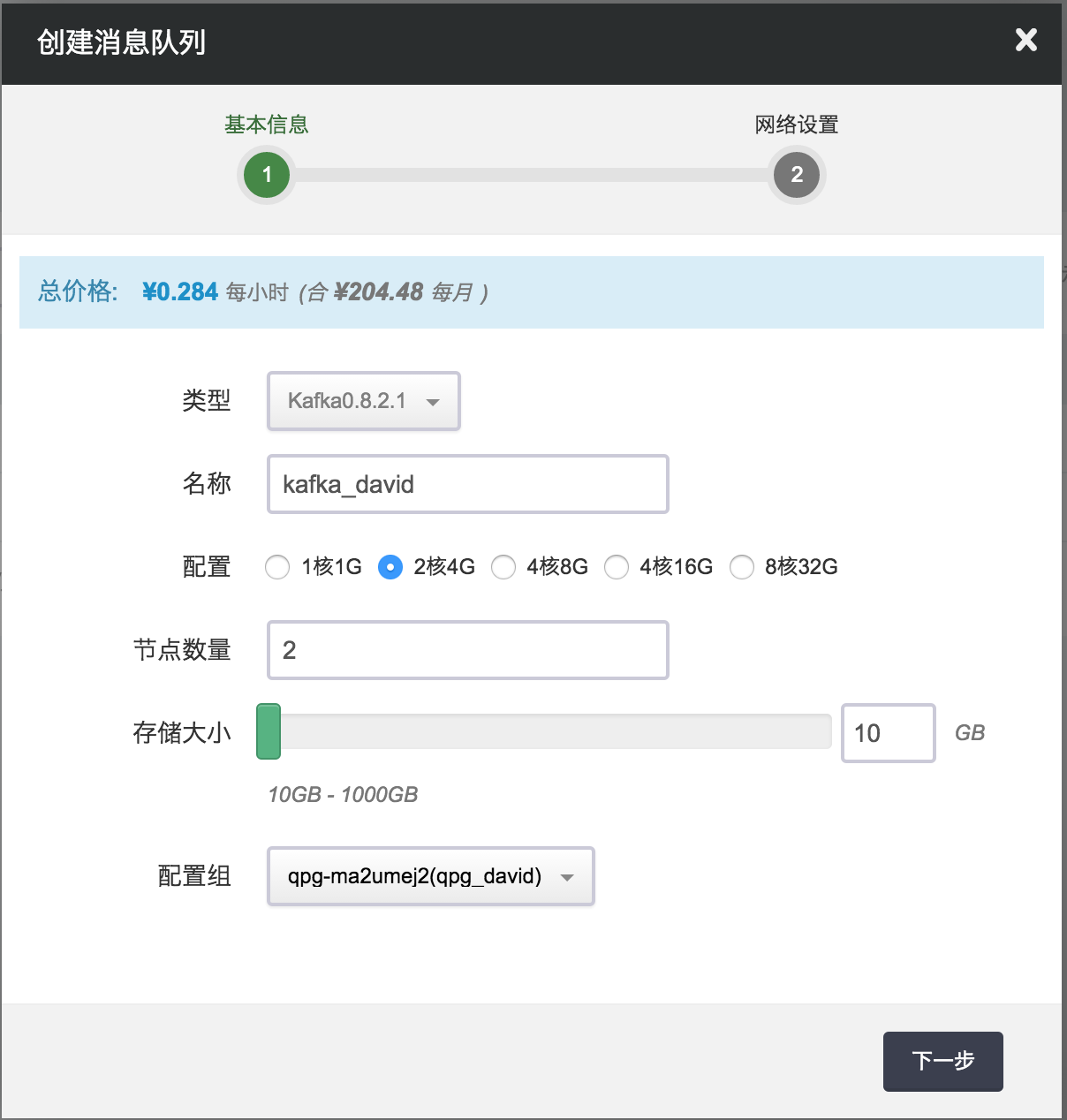 在创建的对话框中,您需要选择 Kafka 版本号及 CPU 和内存配置,填写名称(可选)、节点数量和存储大小,选择配置组,然后点击下一步。