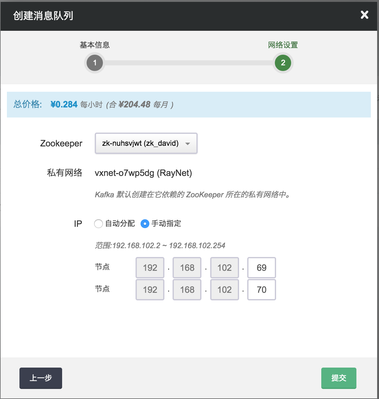 在配置网络的过程中,首先选择 Kafka 所需要的 ZooKeeper 集群, Kafka 集群将加入该 ZooKeeper 所在的私有网络中, 然后可以为 Kafka 中的每个节点指定 IP, 也可以选择”自动分配”,让系统自动指定 IP。