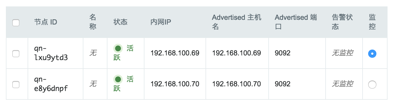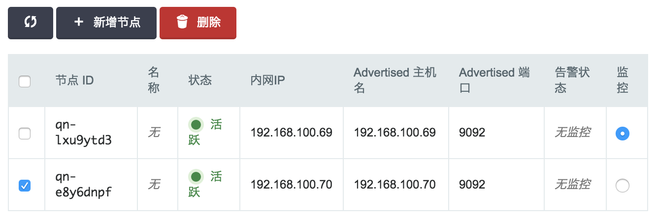 当 Kafka 创建完成之后,您可以查看每个节点的运行状态。 如图所示,当节点显示为 “活跃” 状态,表示该节点启动正常。当每个节点都启动正常后 Kafka 集群显示为“活跃” 状态,表示您已经可以正常使用 Kafka 服务了。