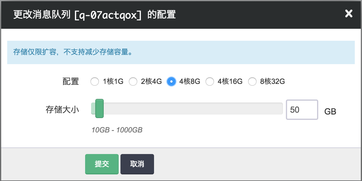 您可以如下图所示纵向伸缩 Kafka 的 CPU、内存、硬盘,您可以根据青云提供的监控结合您的业务情况决定是否纵向伸缩。