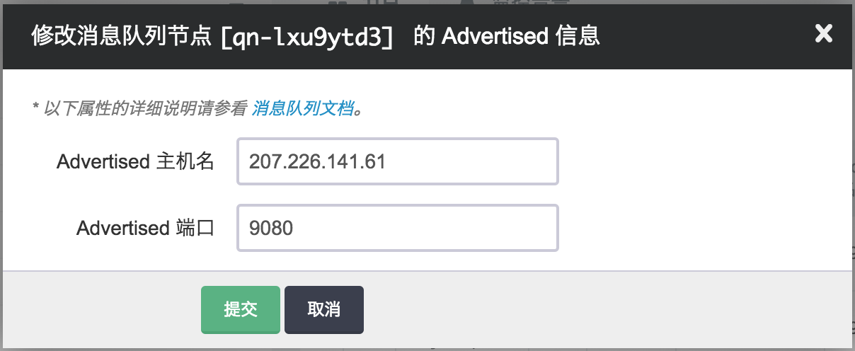 青云提供灵活的网络配置, Kafka 在实际使用中会出现 producer,consumer 与 broker 都不在一个网段之中, 这个时候需要在 broker 所在的路由器上配置端口转发,并且需要修改 broker 的 advertised host 与 advertised port 为路由器转发的源地址和源端口。这是因为 Kafka 各节点(broker, producer, consumer) 之间是靠 advertised host 与 advertised port 通讯的。假设路由器的 IP 地址是 207.226.141.61,端口9080转发到 Kafka broker 192.168.102.69端口9092, 右击该节点,选择“修改 Advertised 信息”, 然后如下图所示填入正确的信息。同理依次修改其它节点。