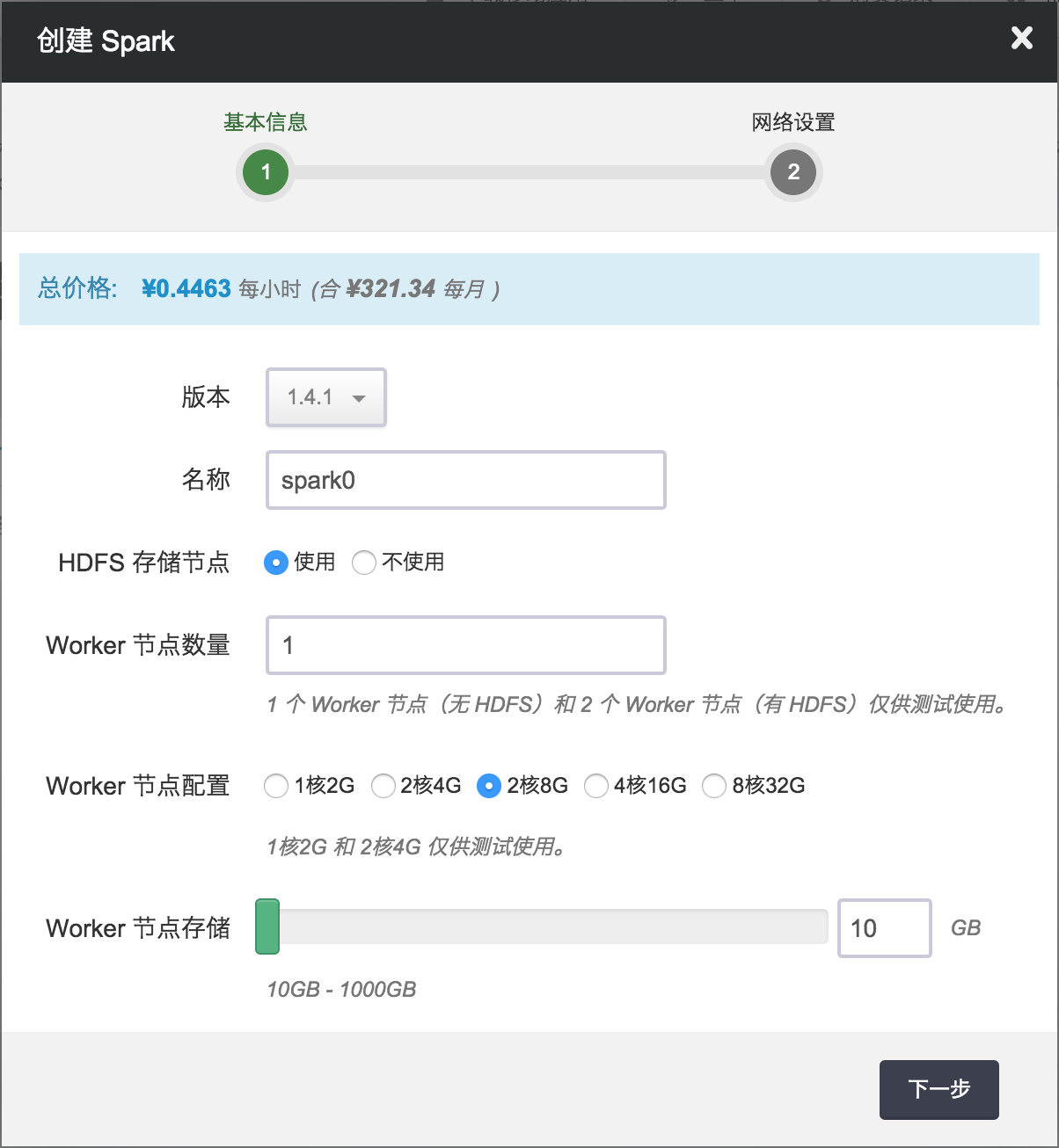 在创建的对话框中,您需要选择 Spark 版本号、CPU、内存配置,集成 HDFS 与否,节点存储大小,填写名称(可选)和 worker 节点数量等。