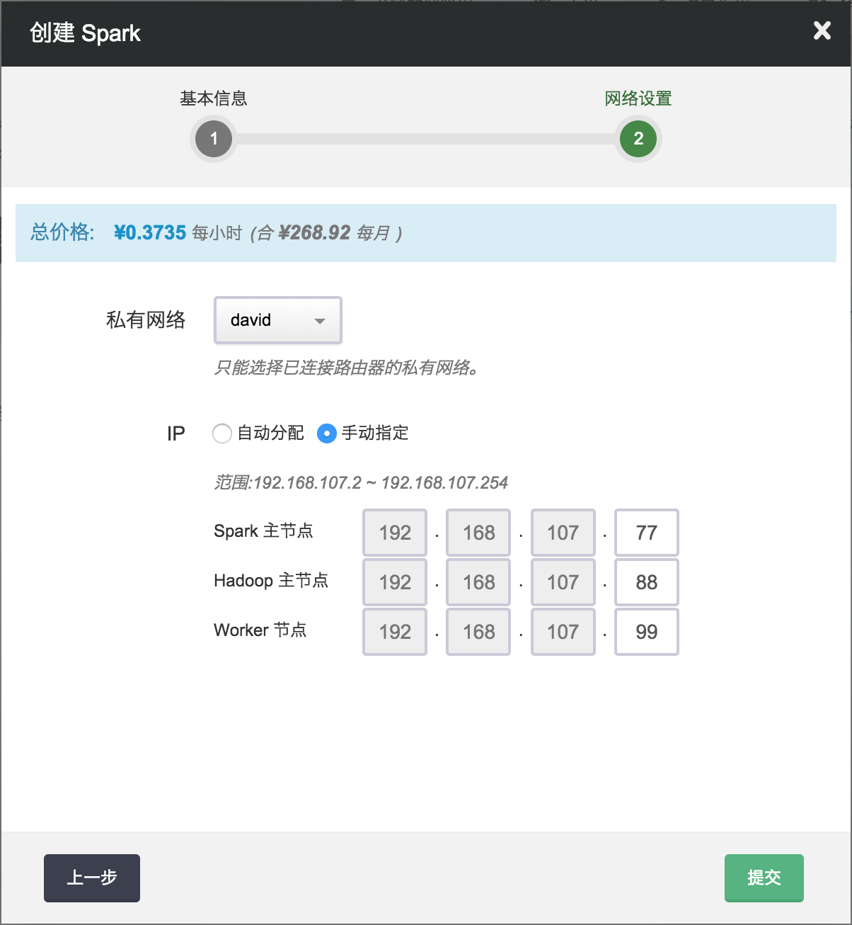 在配置网络的过程中,首先需要选择 Spark 要加入的私有网络,然后可以为 Spark 中的每个节点指定 IP, 也可以选择“自动分配”,让系统自动指定 IP。