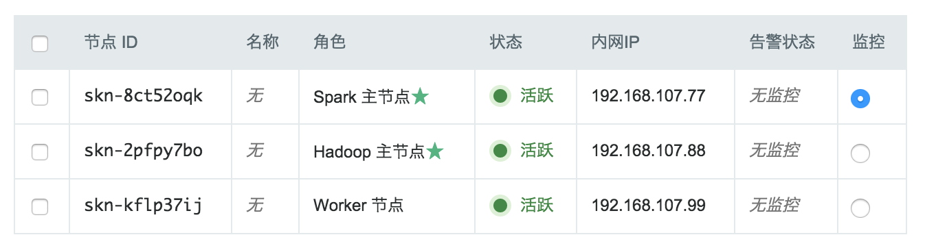 当 Spark 创建完成之后,您可以查看每个节点的运行状态。 如图所示,当节点显示为“活跃”状态,表示该节点启动正常。 当每个节点都启动正常后 Spark 集群显示为“活跃”状态,表示您已经可以正常使用 Spark 服务了。