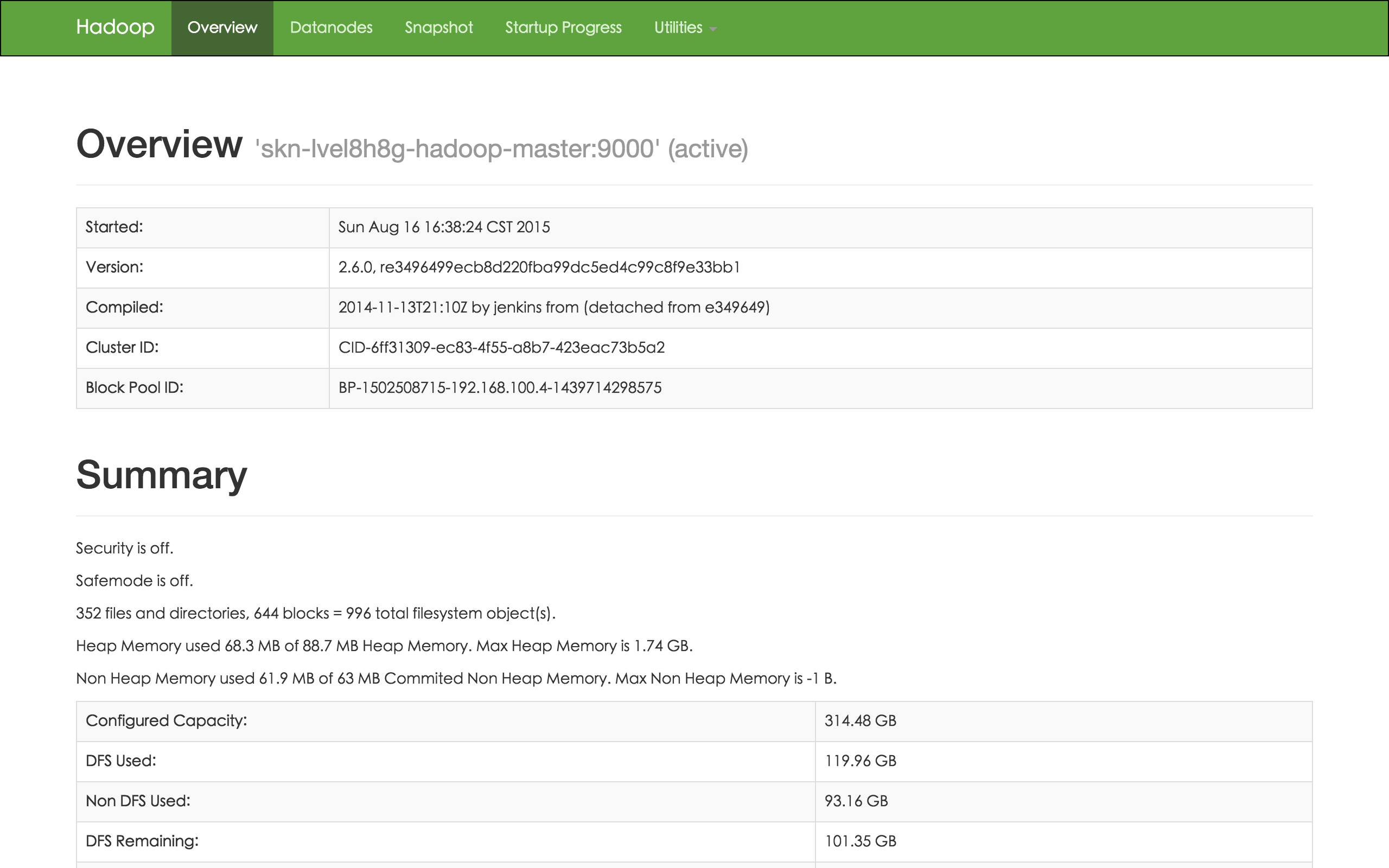 Spark 和 Hadoop 提供了丰富的监控信息。如果需要通过公网访问这些信息您需要先在路由器上设置端口转发,同时打开防火墙相应的下行端口。Hadoop NameNode 默认端口是50070, Spark master 默认端口8080提供了集群的信息,Spark driver(您的客户端,基于映像市场工具分类中 Spark Client 创建的一个主机) 的默认端口是4040,提供了当前运行的 应用监控信息。因此私网可以访问以下 URL: