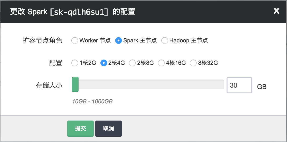 由于不同类节点压力并不同,所以青云 Spark 支持对 Spark master节点、Hadoop NameNode 和 Spark worker节点分别进行纵向伸缩。通常情况下两个主节点的压力不会太大, 在创建 Spark 的时候我们自动给两个主节点分配较低配置,但随着压力增大您可能需要对这些节点扩容。