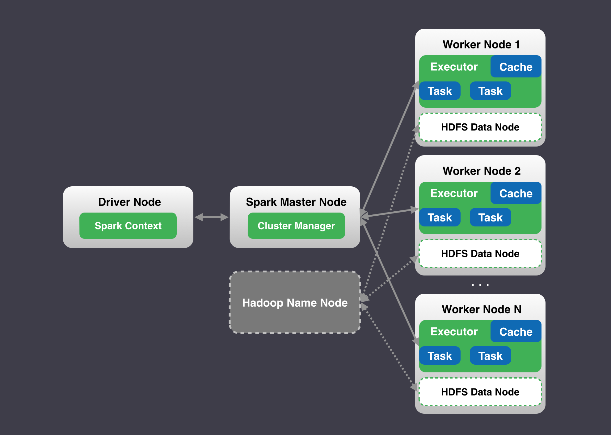 与 Hadoop 一样, Spark 采用的是 master/slave 架构。青云既提供纯计算引擎的 Spark 集群,也提供与 Hadoop HDFS 集成的 Spark 集群,后者 Spark 的 worker 节点运行在 Hadoop 的存储 HDFS DataNode 节点上。 如下图所示,青云 Spark 集群分三种节点类型:主节点 (Spark master node 和 Hadoop NameNode),从节点 (Spark worker nodes 和 Hadoop DataNodes) 和客户端 (Driver node)。青云 Spark 目前 采用的是 Standalone cluster manager 进行集群资源管理,用户通过客户端与 Spark、Hadoop 集群交互,用户的 driver program 将运行在 driver node上。详情见下面测试 Spark 章节。