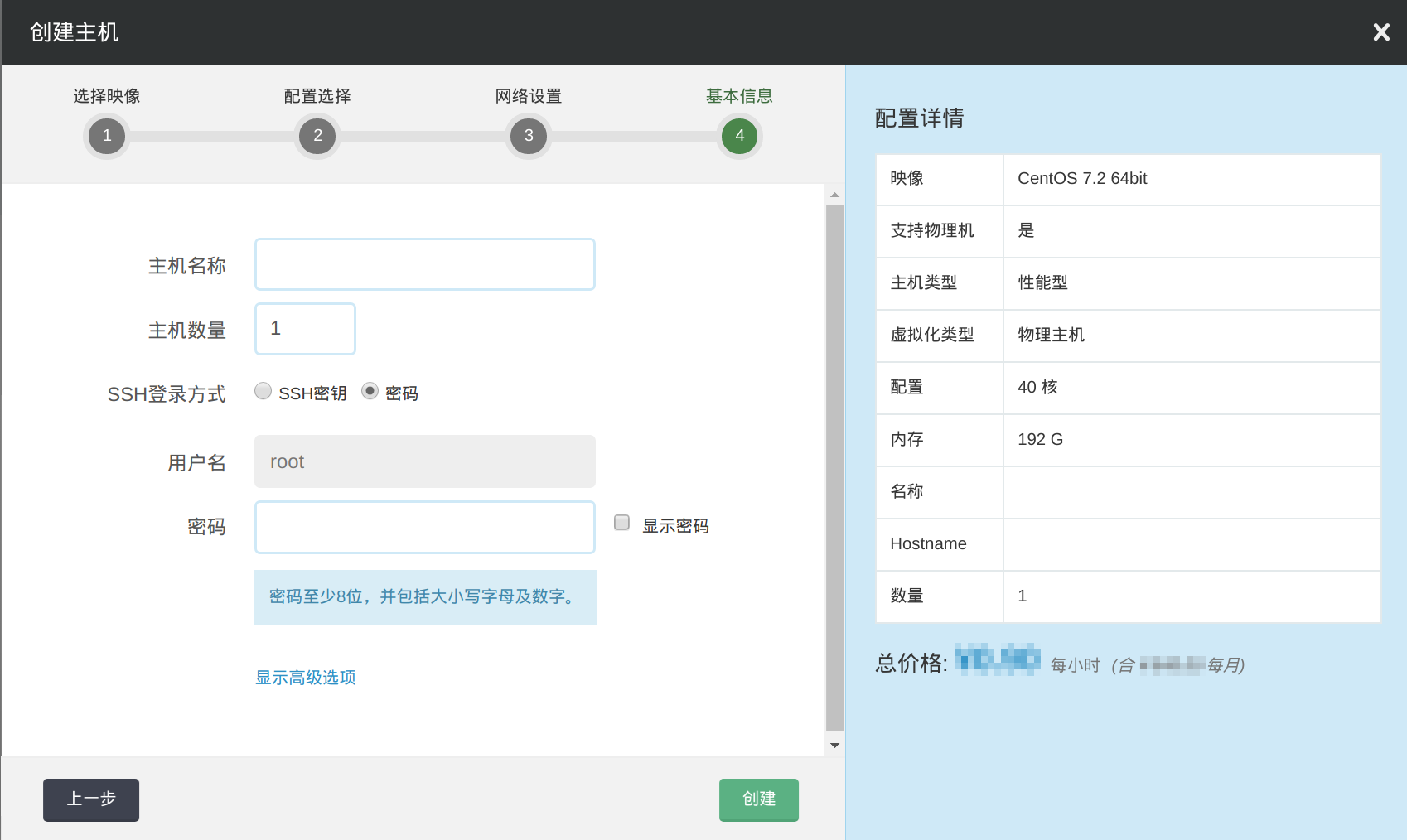 第四步:设置主机名称、登录方式等信息,然后点击创建。