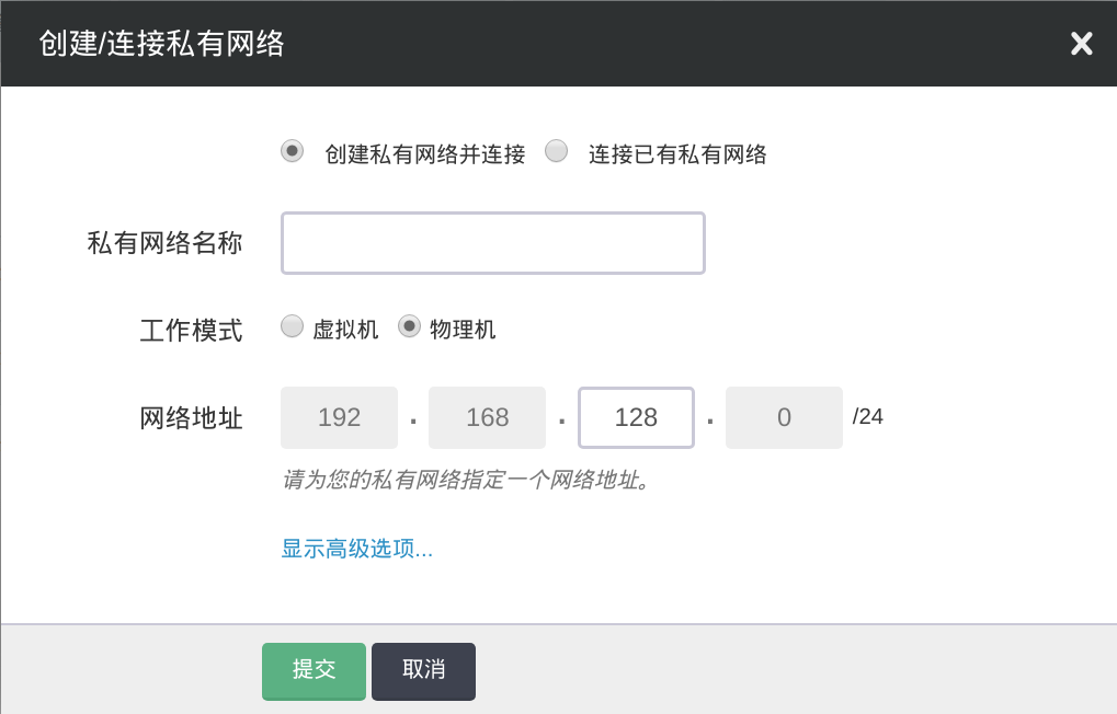 点击创建好的 VPC 网络进入其详情页面,在私有网络界面下点击创建按钮,将工作模式设为物理机即可创建物理主机网络。