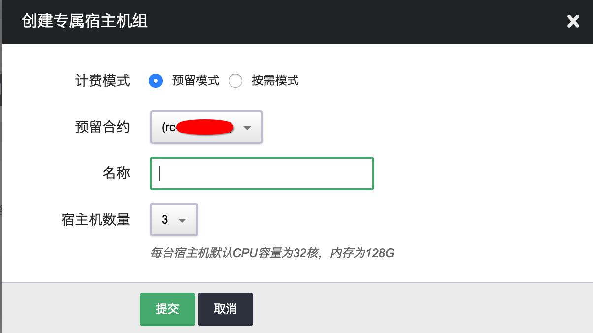 创建专属宿主机默认为预留模式(详情参考 预留资源计费模式 )。按需模式(试用)需要单独提工单申请配额。