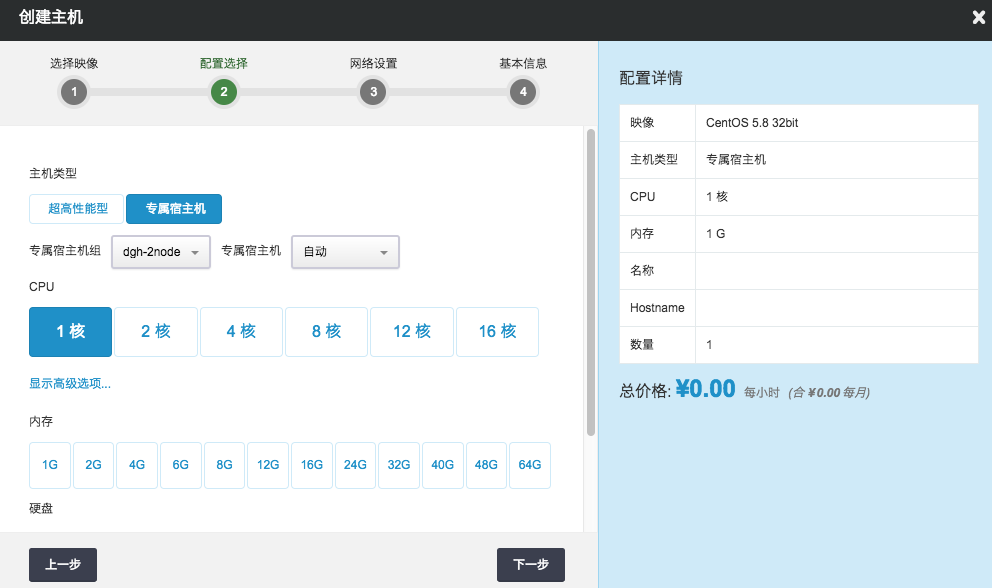 第二步:选择配置 在选择配置里 点击 专属宿主机 类型,通过下拉菜单指定 专属宿主机组 和 专属宿主机,之后选择CPU和内存等配置。
