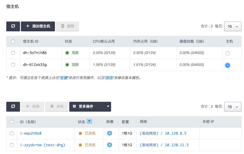 通过点击 专属宿主机组 的ID可以进入专属宿主机组的详情页面,在宿主机列表可以看到宿主机的ID、状态、以及CPU和内存的使用情况; 通过切换右侧的宿主机按钮,可以在下方实例列表里看到运行在该宿主机上的实例信息。