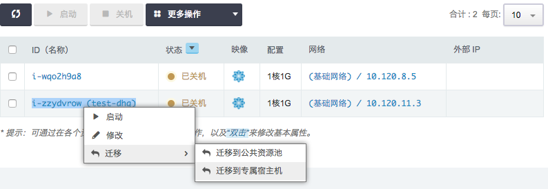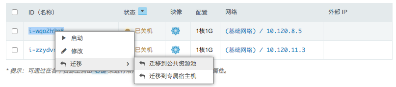 对于专属宿主型实例,可以从一个专属宿主机组迁移到另一个专属宿主机组,也可以在同一组内的不同宿主机上进行迁移,实例需要为关机状态。