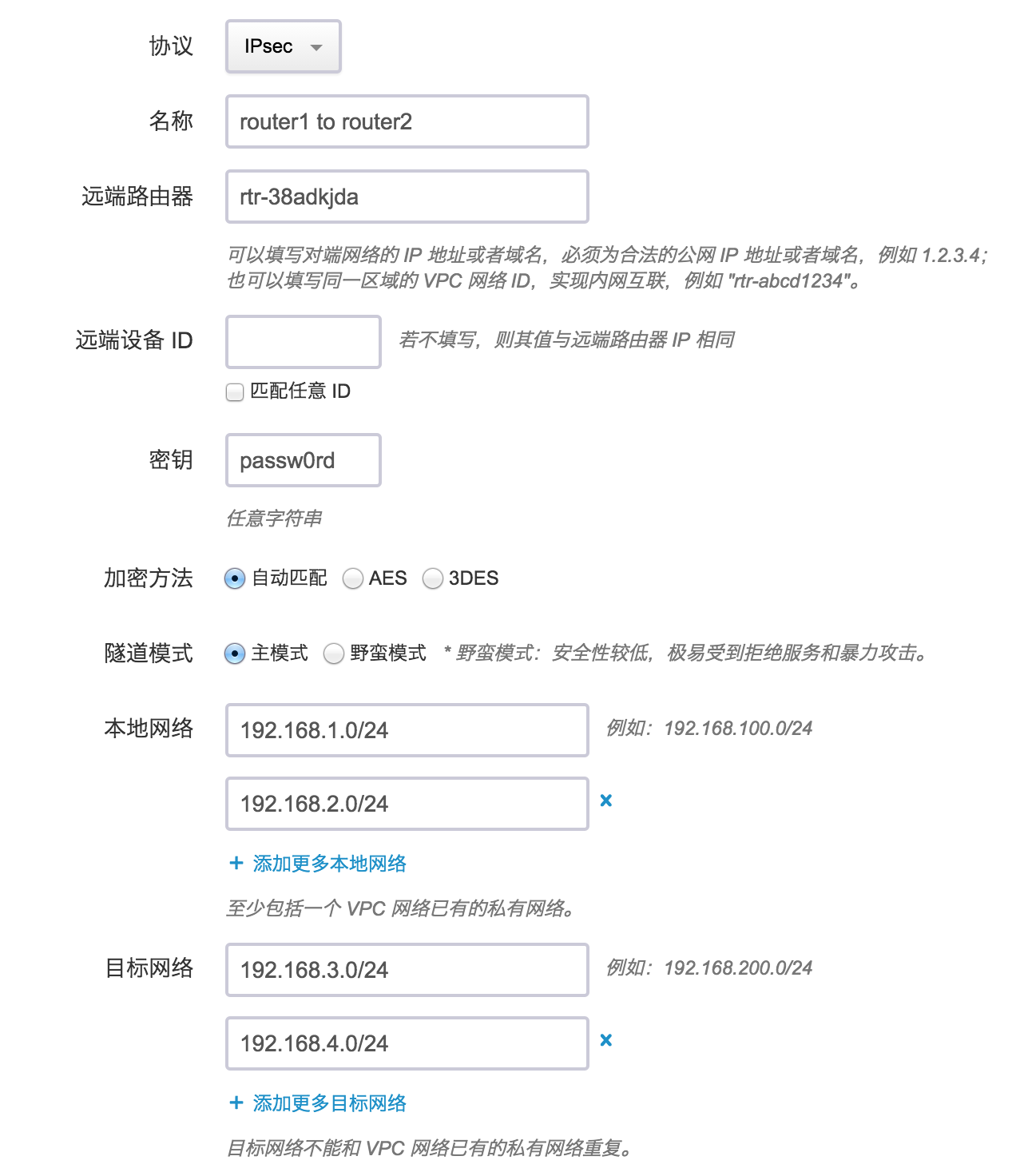 依物理设备的品牌和型号,IPsec 的配置方法会存在差异性。请参阅设备的用户手册确定正确的配法。