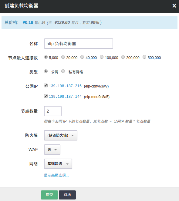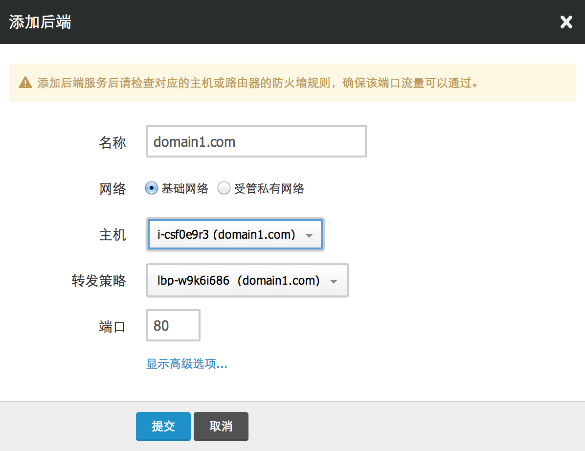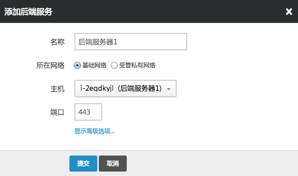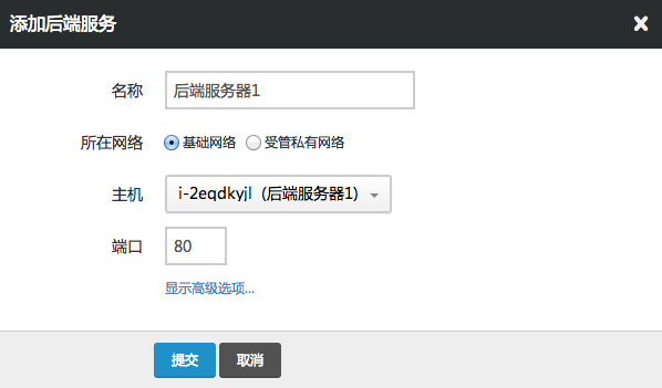 如图所示,”所在网络” 依旧选择 “基础网络”, 然后从 “后端服务器” 的下拉菜单中选择我们已经配置好的 web server,”端口” 填 “80”,然后点击提交。
