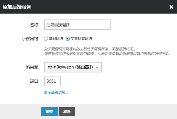 如图所示,在 “所在网络” 我们需要选择 “受管私有网络”, 然后从 “后端服务器” 的下拉菜单中选择 “路由器 1”, “端口” 填 “8081”,然后点击提交。同理,添加另一个后端服务器, 从 “后端服务器” 的下拉菜单中依然选择 “路由器 1”,”端口” 填 “8082”,然后点击提交。