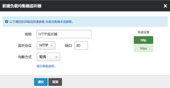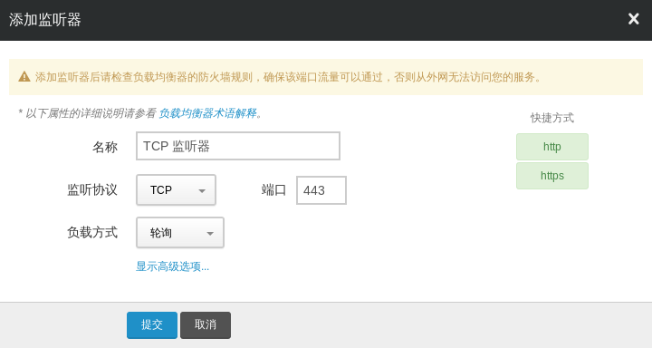 添加监听器后请检查负载均衡器的防火墙规则,确保 80 端口流量可以通过,否则从外网无法访问你的服务 你也可以通过点击右边 “快速设置” 里头的 “HTTP” 协议进行快速设置。另外,HTTP 监听器默认支持 WebSocket 协议。