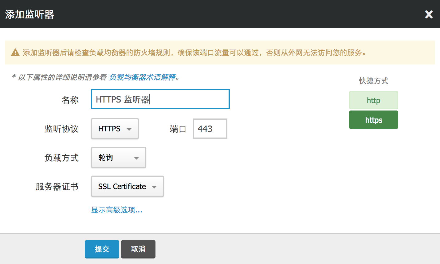 添加监听器后请检查负载均衡器的防火墙规则,确保 443 端口流量可以通过,否则从外网无法访问您的服务