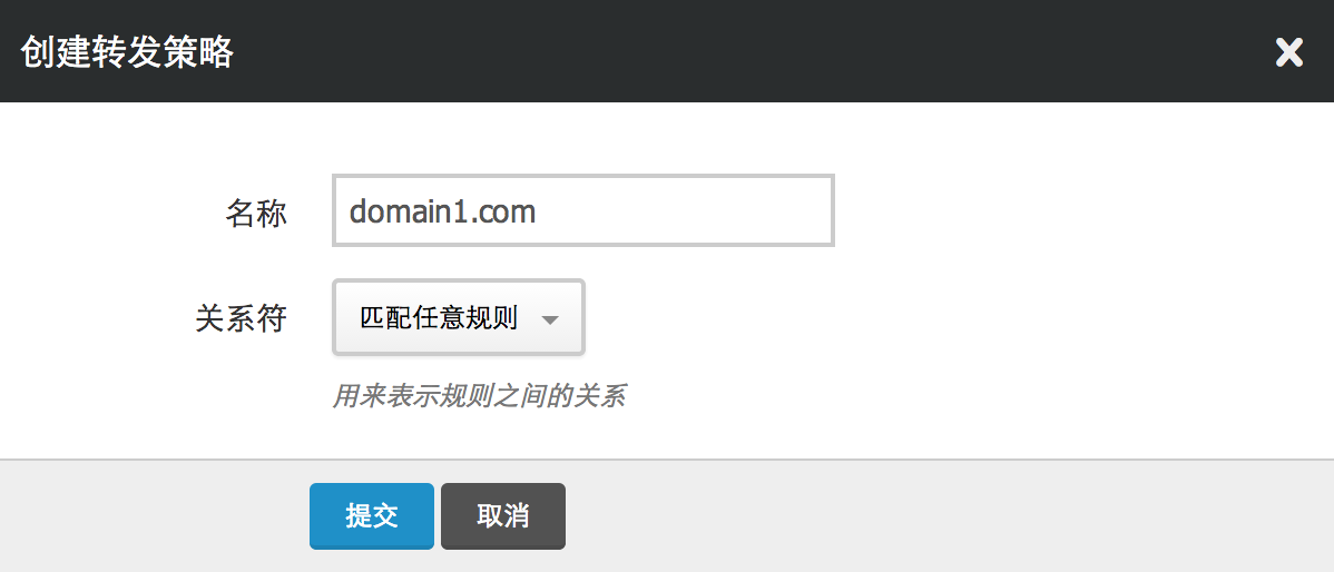 首先创建针对域名 “domain1.com” 的转发策略,为了方便查看,我们命名为 “domain1.com”,如图所示:
