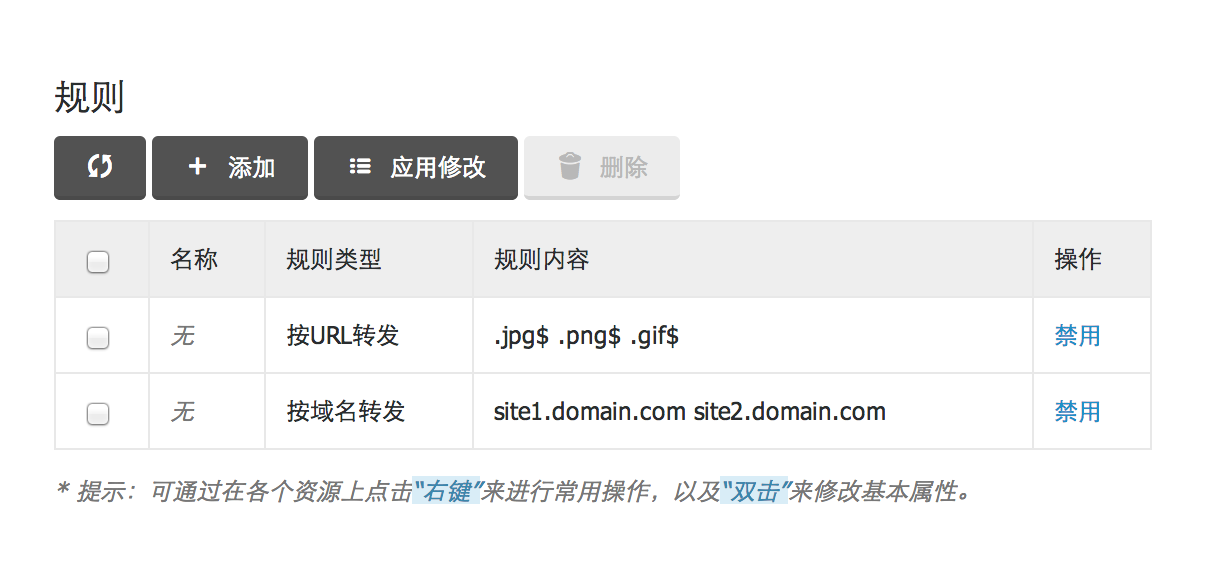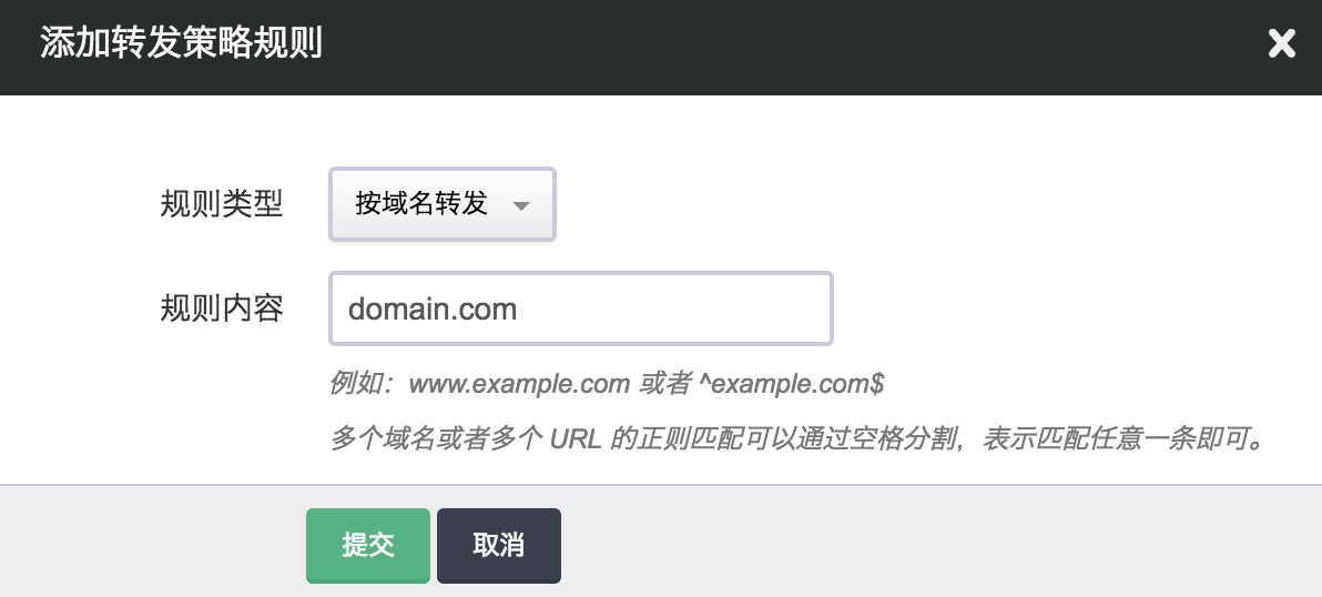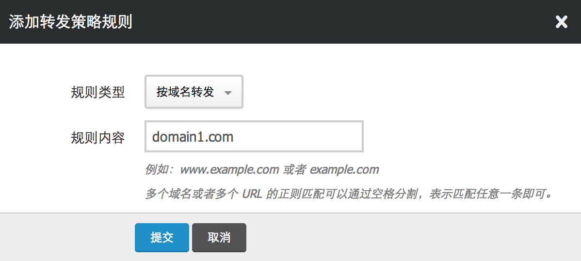 规则内容为 “domain1.com”, 表示匹配任何 “*.domain1.com” 的域名的请求都会被转发,例如 “www.domain1.com” 和 “site1.domain1.com” 等。我们支持正则表达式(Perl Compatible Regular Expressions),例如你可以通过 “^domain1.com$” 来实现精确匹配。