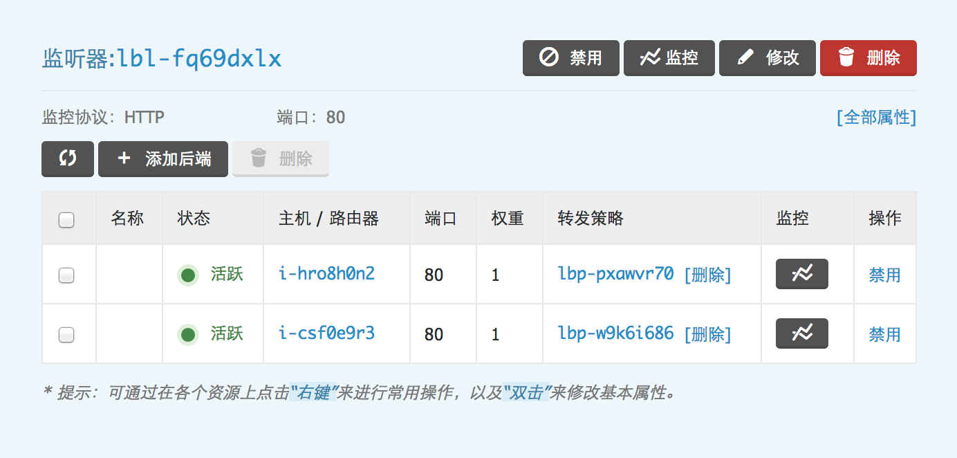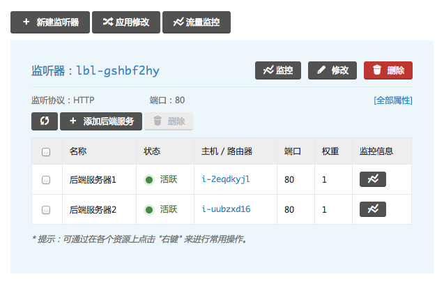 如下图所示,应用修改完成之后,后端服务器会成功被负载均衡器接管, 然后状态会恢复为 “活跃”。此时你通过负载均衡器绑定的IP地址(例如 http://<loadbalancer_eip>/ ), 就可以正常的访问自己的服务了。