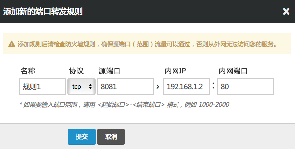 转发规则建立完成后,需要点击 “应用修改” 使修改生效。 同时,我们需要打开路由器对应的防火墙的 “8081” 和 “8082” 端口下行规则, 使得这两个端口可以被外部访问,添加规则之后需要点击 “更新规则” 使得修改应用。