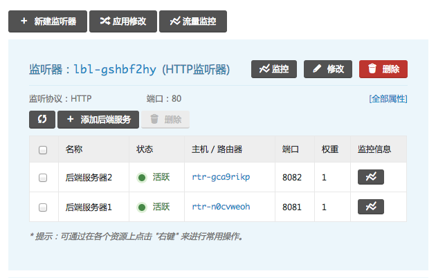 由于你的配置修改还没有被应用,所以后端服务器会显示不可用状态,这是正常的。 这时我们需要点击”新建监听器”旁边的”应用修改”按钮,使得修改生效。