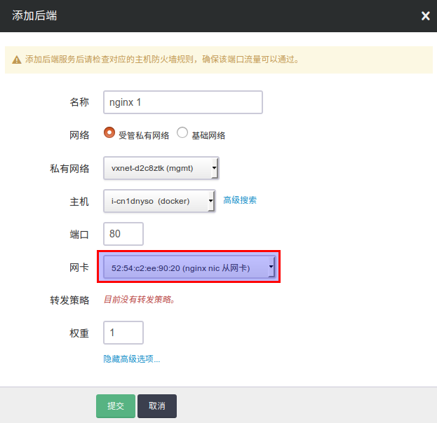 添加 Docker 实例为负载均衡器后端。请参看 负载均衡器指南 创建负载均衡器和80端口的 HTTP 模式监听器。在添加后端时,展开“高级选项”,可以选择主机已挂载的网卡。添加之后,应用负载均衡器修改,这个Nginx应用就开始对外提供服务了。
