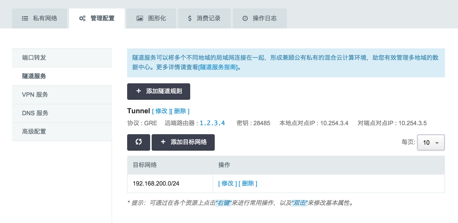 可以通过点击每个属性旁边的图标进行添加、修改、删除等操作。针对 VPC 网络本身的基本操作,比如修改、开启、关闭、扩容和删除等则在“更多操作”的下拉菜单中可以找到。