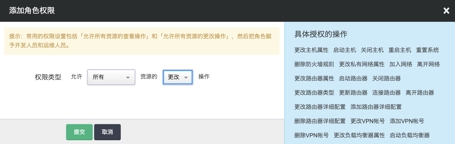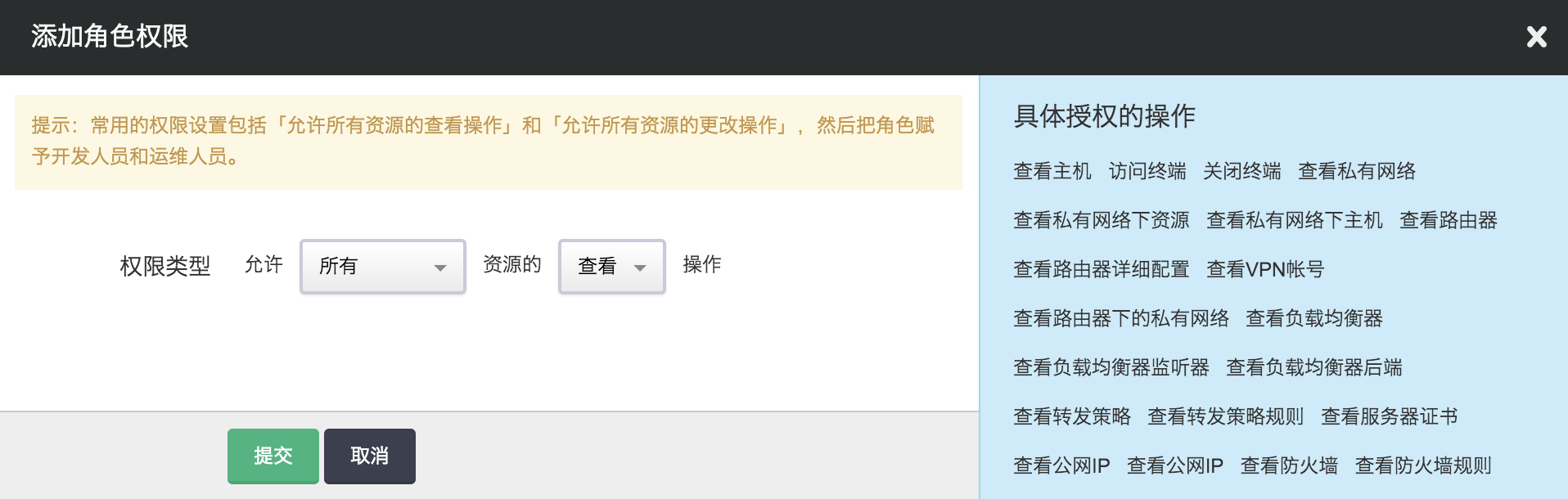配置该角色的权限。对于 运维 角色,我们希望他们具有以下权限:
