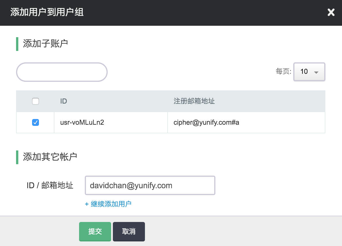 可以将任意用户加入到该用户组中,如子账号或其他主账号。可以输入用户 ID 或账号邮箱。
