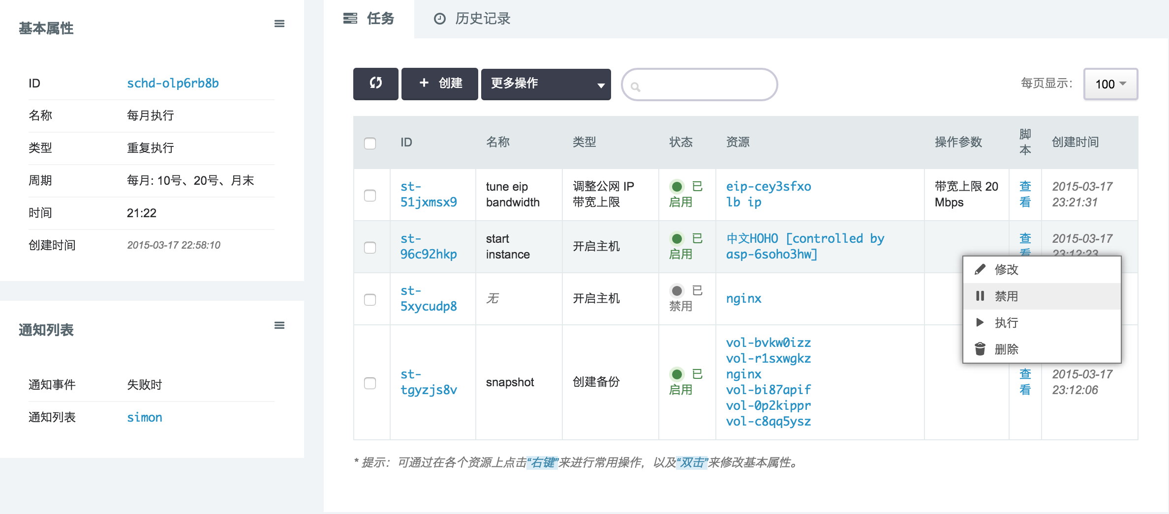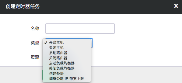 定时器(Scheduler)功能可用来定期执行一系列任务,比如定时开关主机、创建备份、调整带宽等。 可在指定的周期重复执行,也可仅执行一次,且每个任务支持多个资源批量操作。 任务执行后会发出通知到用户指定的通知列表并保留近期执行的历史记录。