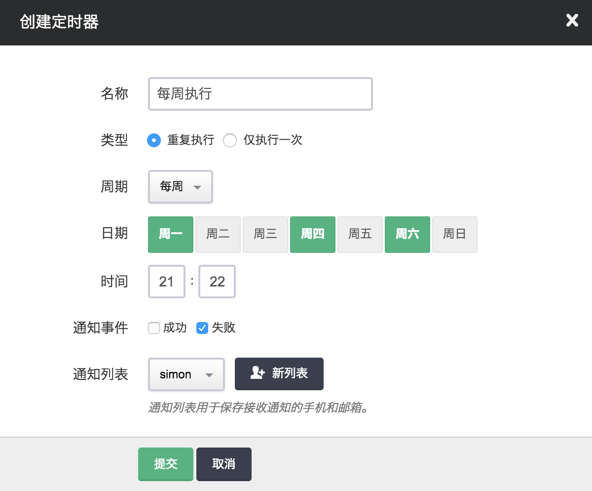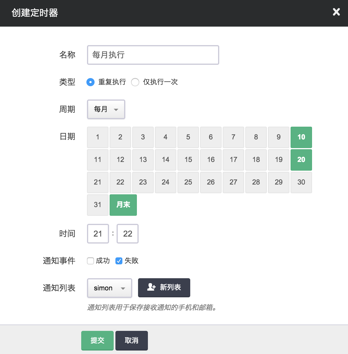 创建定时器时,要指定为『仅执行一次』还是『重复执行』,其中重复执行还分为 『每n小时』、『每天』、『每n天』、『每周』、『每月』,并且可以详细指定每周几或每月几号执行。